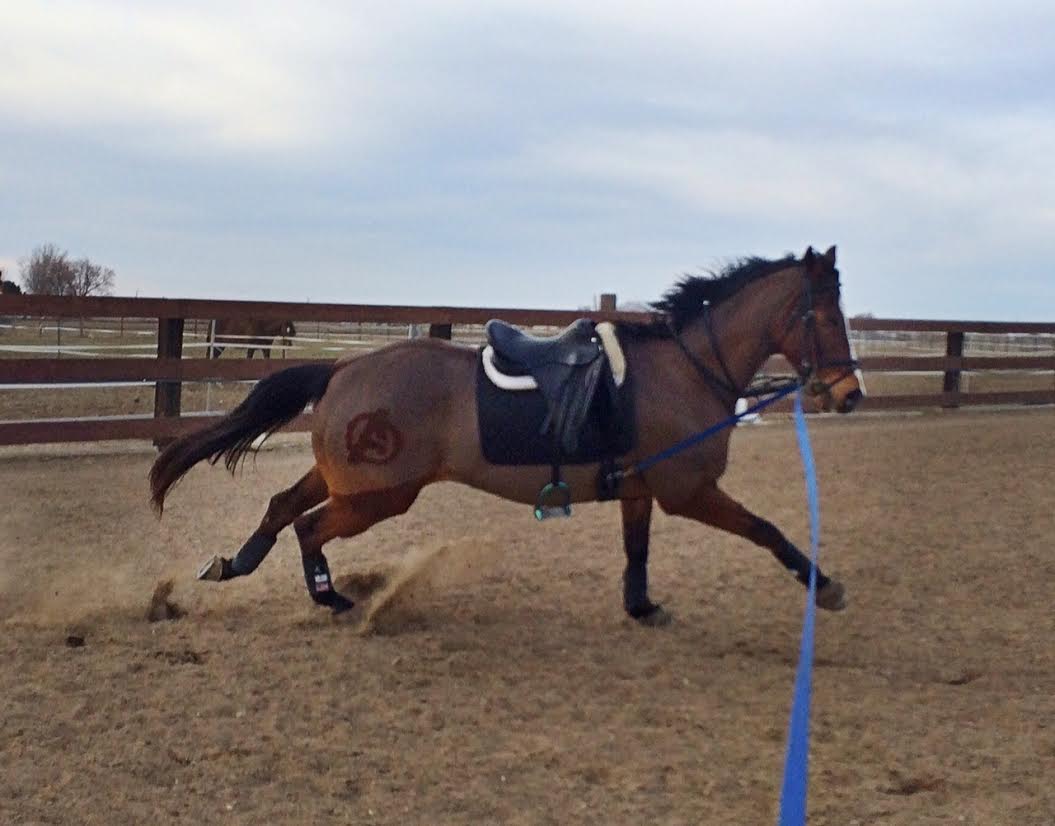 If you've looked at my many (many many) lunging pictures from the past year, you probably noticed that I had been running the lunging line through the inside bit ring back to the girth with one fixed outside side rein. This arrangement was preferable to two fixed reins, which Courage will just invert and brace against, but when he kicked it in to flight mode, it still gave him something to really brace on and blast away.